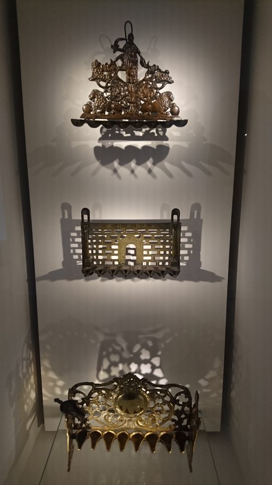 Dr Ticho collected Hanukkah lamps, the oldest of which dates from the 1400s. According to the text in the museum in Ticho House, the lamps came from all over, from Europe to Russia and Afghanistan. It goes on to say that he hung the lamps on the walls around his desk; today a few lamps from the collection are on display behind glass. Some are in the Israel museum. A Hebrew teacher said that some of the collection was stolen in the 1990s and never recovered — but how do I know I understood her correctly? The museum exhibition makes no mention of any theft or loss of lamps.
