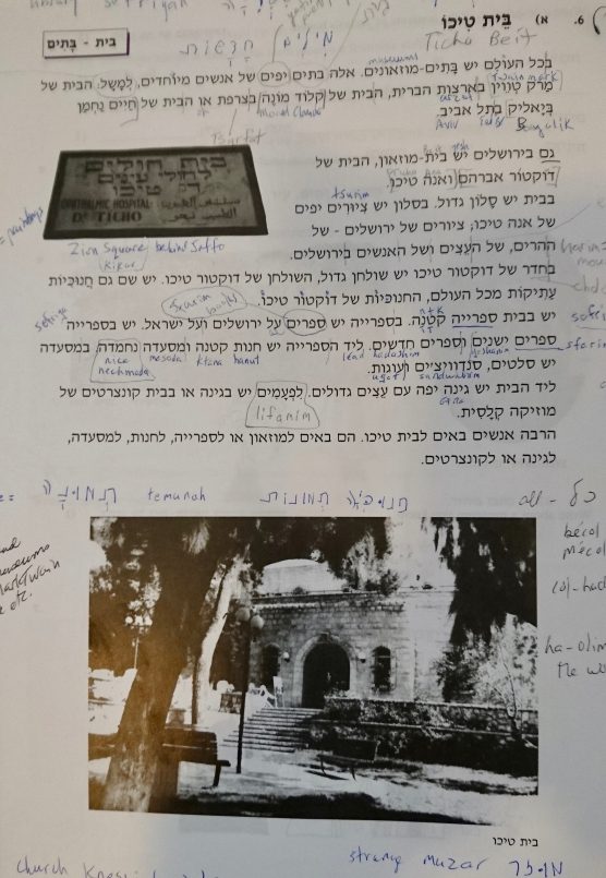 Ticho House gets a full page in the beginner’s Hebrew textbook, a text dense with such vocabulary as paintings, books, gardens, and mountains. The first time I “read” the text, I understood that Mark Twain and Claude Monet had both lived in this amazing 19th century house, and that it was at one point owned by a man called Avraham Ticho and his daughter Anna. When I am trying to understand something in another language, I bring to the text the knowledge that I have, much as I imagine archeologists do when faced with a handprint on an ancient clay wall. In my case, Canadian heritage houses are occupied by writers — think of Pierre Berton House and Al Purdy House. So why not Mark Twain shacking up with Claude Monet? Six months later, in a rereading of the text, I learned that a comparison was being made — other houses owned by famous people (Twain, Monet) are museums, too, just like Ticho House. But how did I draw from “Dr and Anna Ticho” that this was his daughter rather than his wife? No idea.