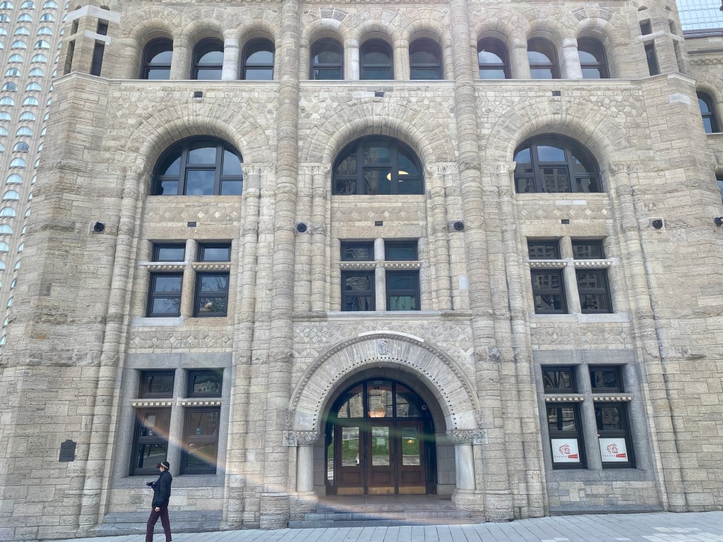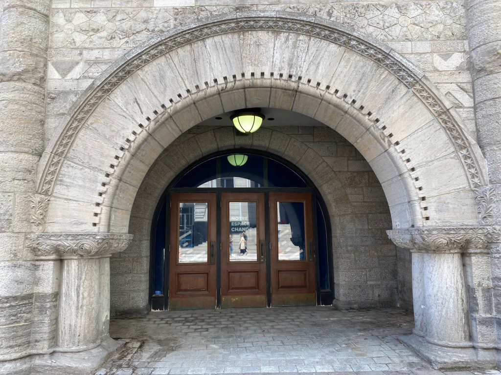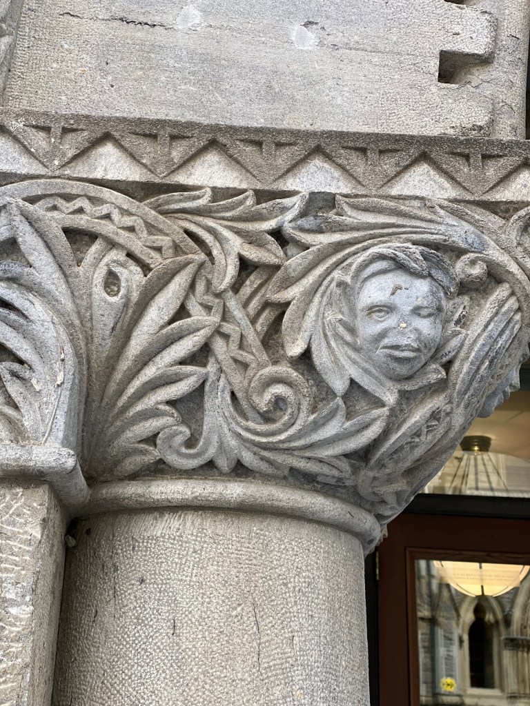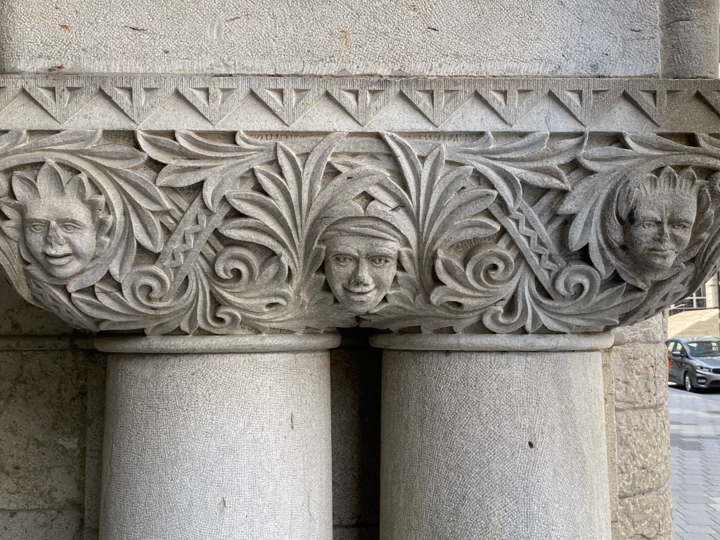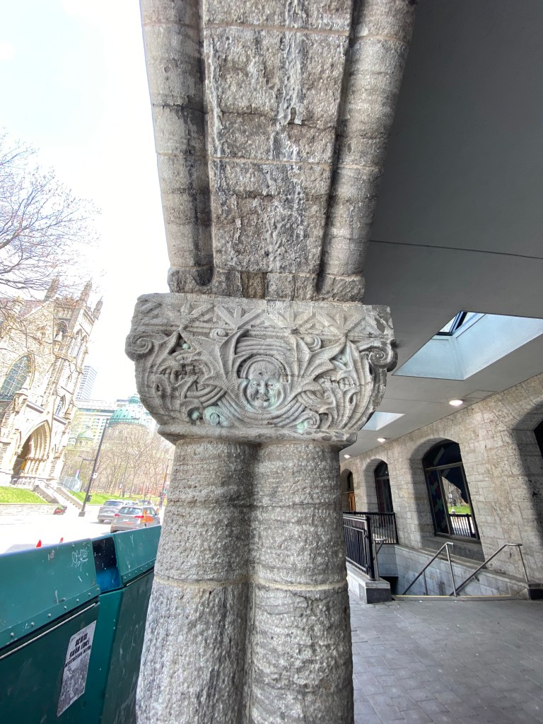 On my last day of a weekend trip to Montreal, after looking for the Green Man on various churches and, uh, old buildings (okay, I am no student of architecture), I came across these faces near where I was staying. These variations on the Green Man are at Windsor Station, on rue de La Gauchetière/ avenue des Canadiens. Given that the street was filled two days earlier with an anticipatory crowd for the hockey game at the Bell Centre forum, it seems appropriate that these faces are smiling together at eye level, rather than in solitary isolation high above.