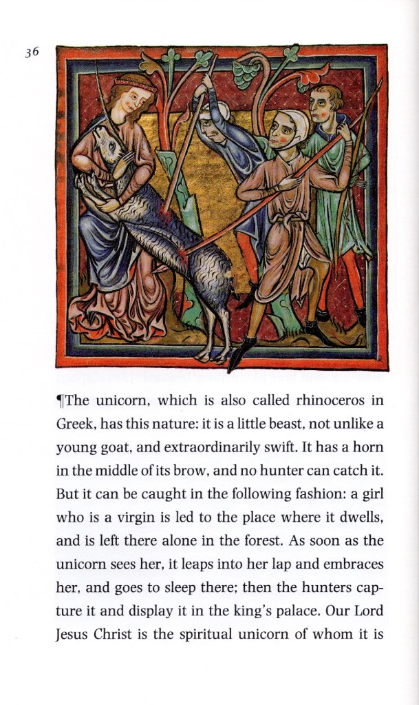I’ve been reading Bestiary, a reproduction of M.S. Bodley 764, translated by Richard Barber, published by the Folio Society in 1992, and find it strangely reassuring. The book has facsimiles of the miniature manuscript illustrations of animals, along with the 13th century text. The text includes not only descriptions of the animals but also what the Creator intended us to learn from animals. Some of the lessons are surprising: the lion is merciful but the fox is the devil, as is the wolf, but not the loyal loving dog.